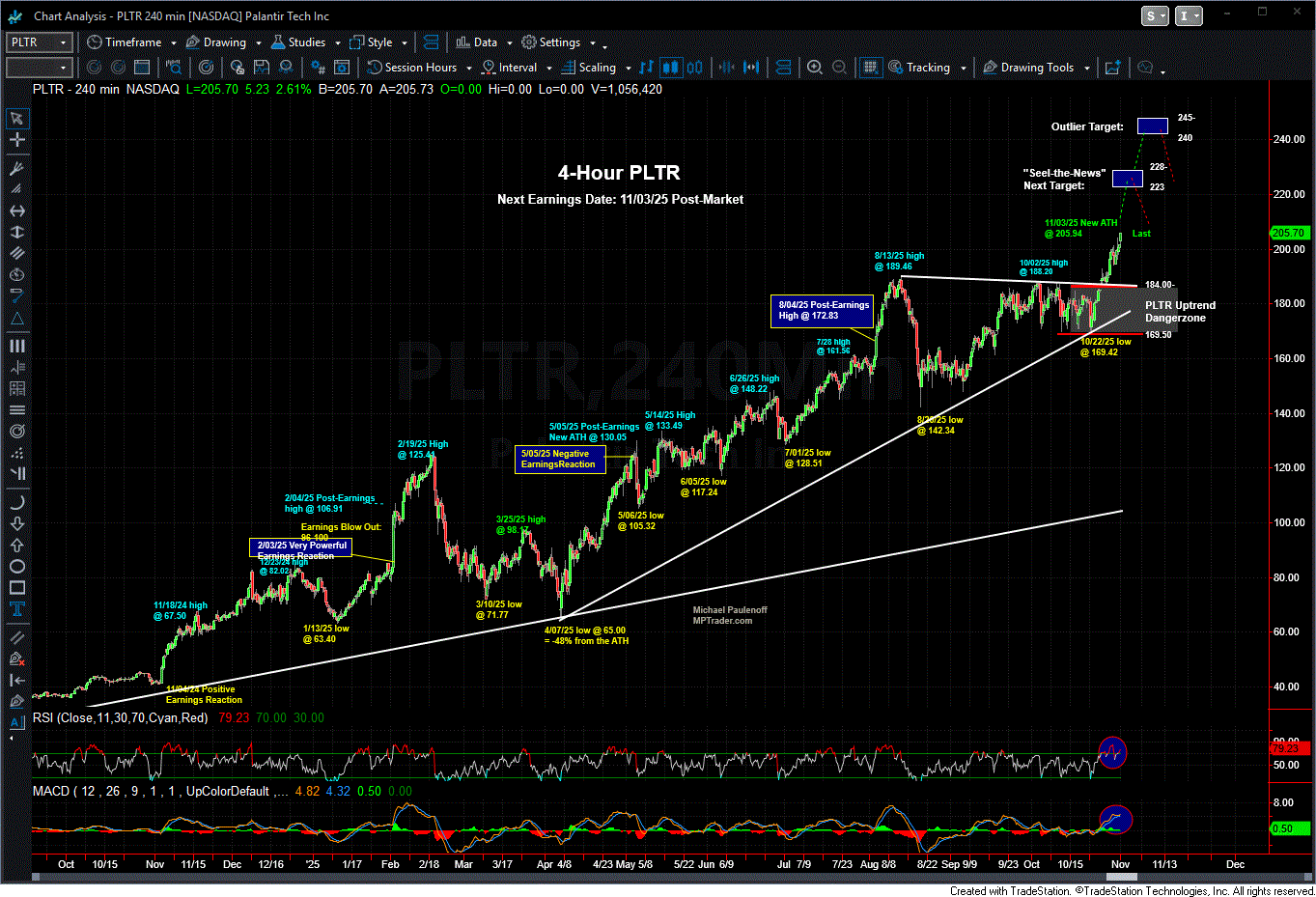 PLTR-- My attached 4-Hour Chart setup shows PLTR is up 2.6% to a new ATH at 205.94 (so far) in pre-market trading ahead of Earnings. Technically, my near and intermediate-term setups argue for upside continuation to my next optimal target window of 223 to 228, with a blow-off positive reaction projected into the 240-245 area.