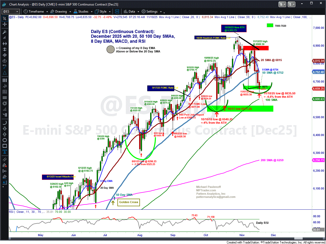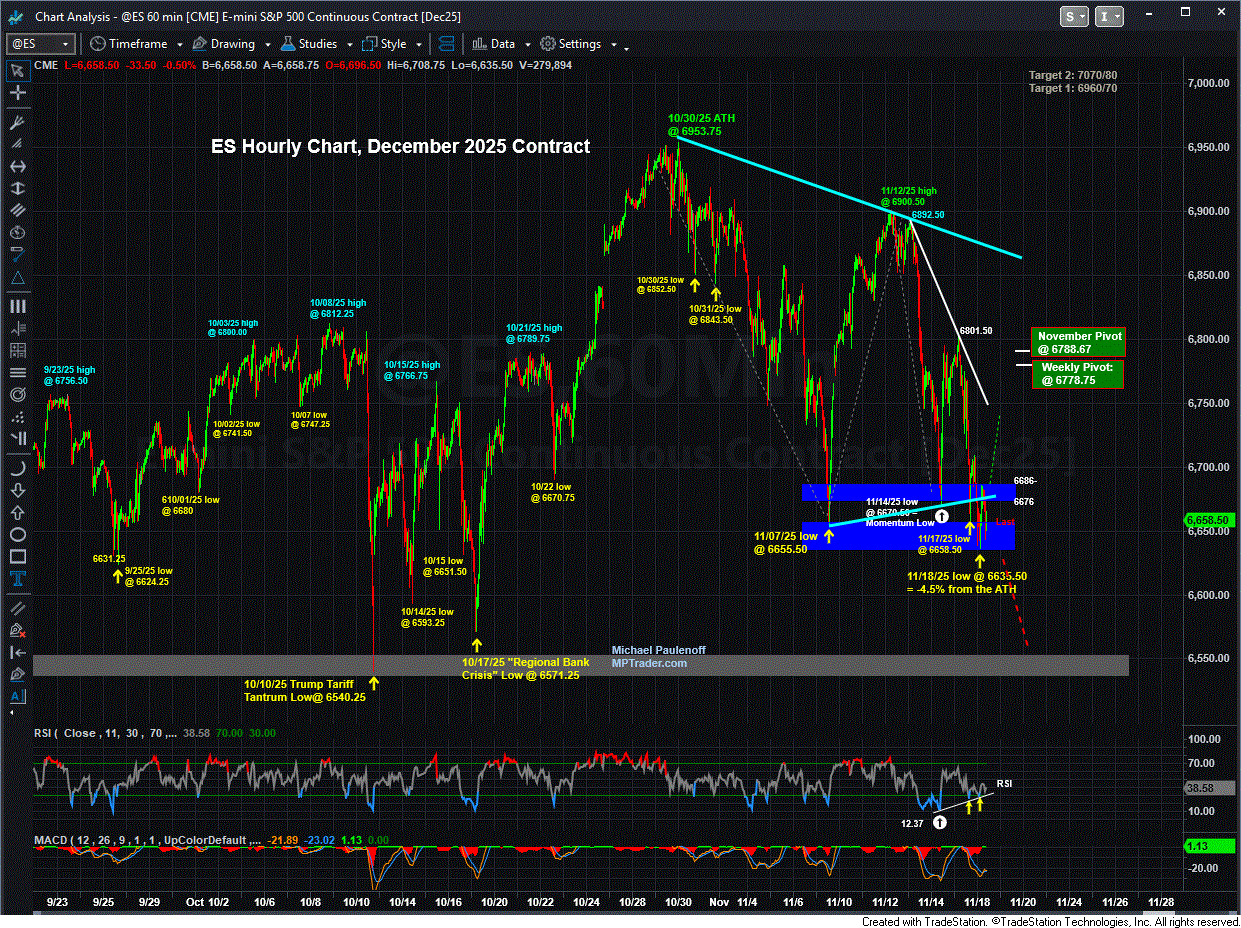 Good Tuesday Morning, MPTraders! November 18, 2025-- Pre-Market Update: More of the same stair-step selling pressure that is threatening to invalidate my bullish Coil formation, which will morph the correction off of the ATH into a deeper, possibly total retracement of the upleg from the October 10 pivot low at 6540.25 to the October 30 ATH at 6953.75. The $64,000 question: Can or will the index (ES) regain some upside traction ahead of tomorrow eve's NVDA Earnings report?...