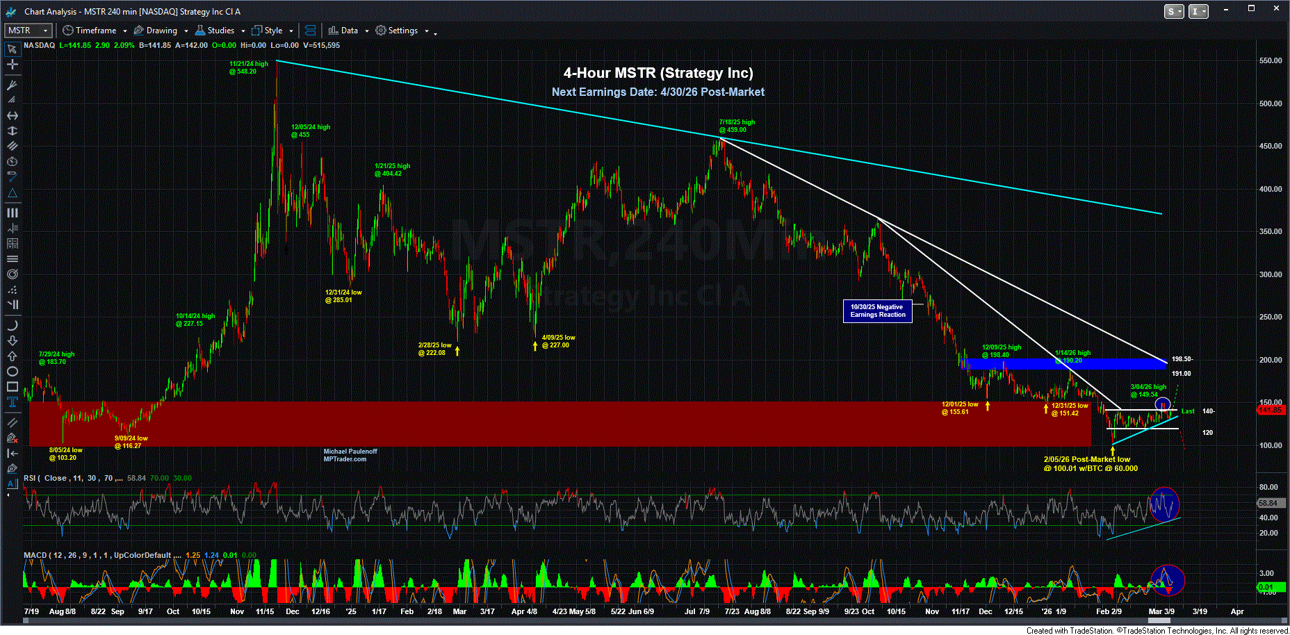 As for MSTR, it too has carved out a counter-trend recovery rally off its February 2026 low at 100.01 that so far, has climbed to 149.54 on 3/04/26. As long as any forthcoming weakness is contained above 130.00, MSTR is poised for upside continuation of the counter-trend rally that should test and take out 149.54 en route to 167-172... Last is 141.80...