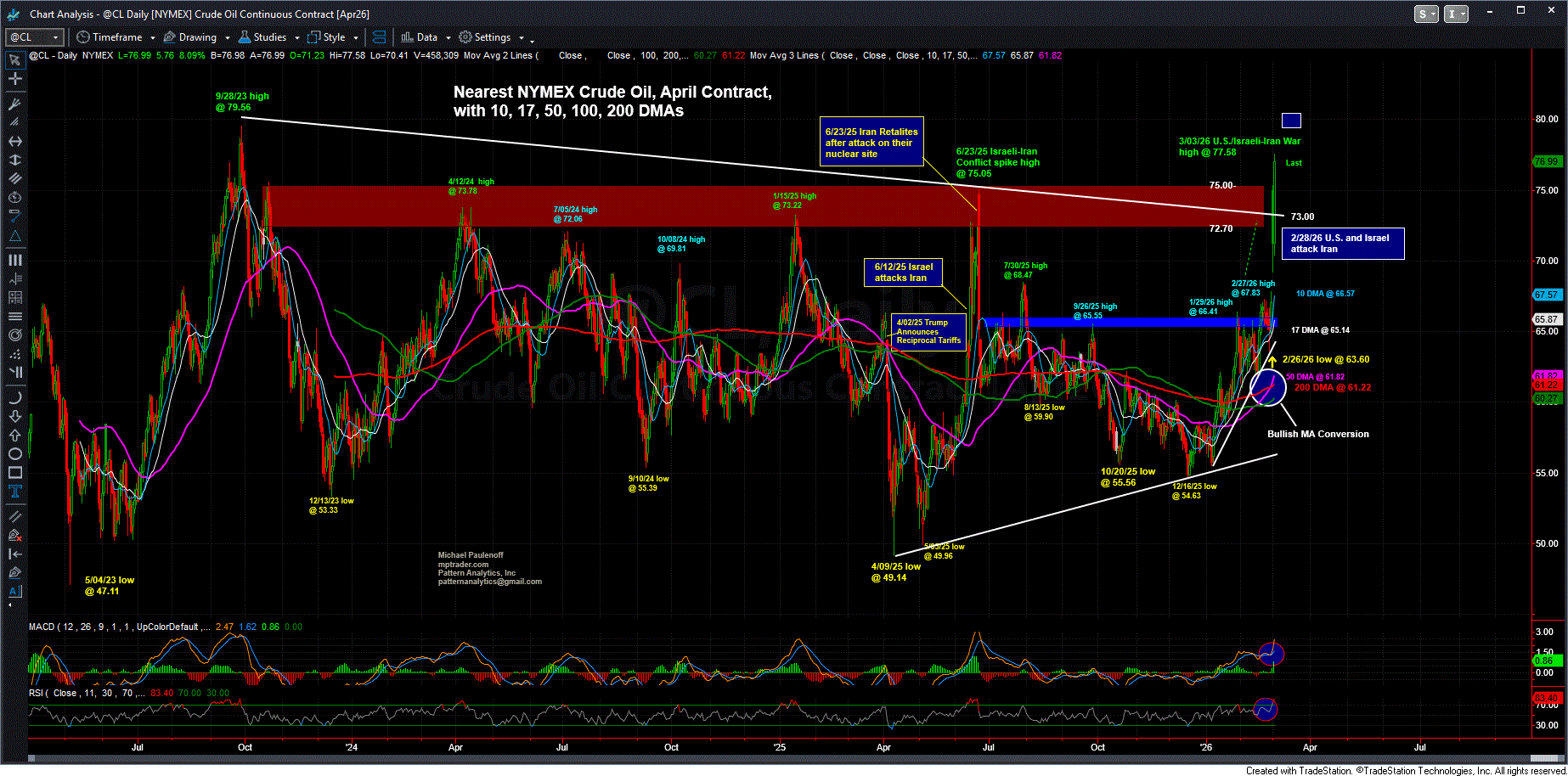 In the absence of a close under $73.00, April Crude points next to $79-$82, indicating that a wider war premium is being built into the price of oil for nearest delivery... Last is $77.30...