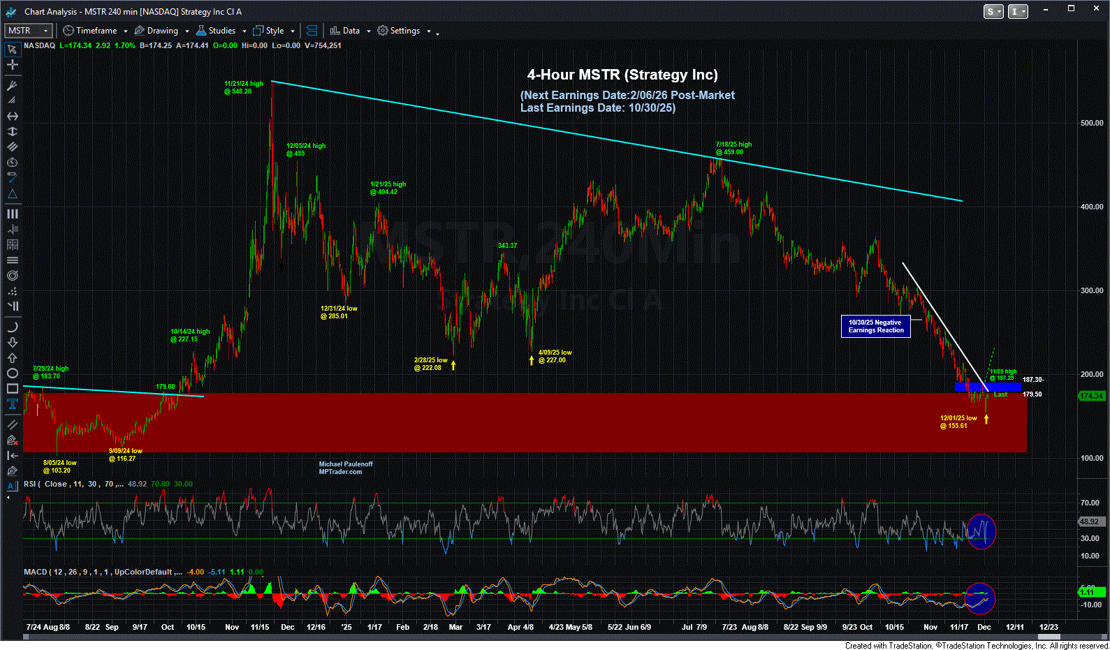 MSTR (Strategy Inc.) is also inching higher in sympathy with BTC, but the stock needs to chew or spike through resistance lodged between 179.50 and 187.30 to gain more upside traction and confirm that a near-term low is in place at 155.61 (12/01/25).