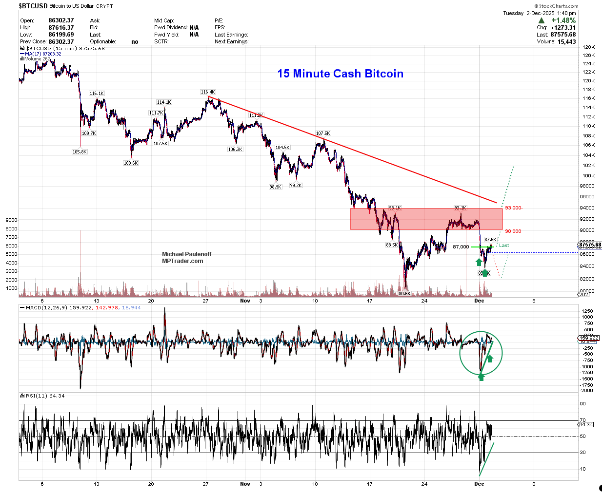 Bitcoin is inching higher this AM as well. I don't know if the "strength" should be attributed to the end of QT, but it certainly doesn't hurt or merely represents an oversold flinch at the moment. In any case, my attached 15 Minute Chart shows BTC is attempting to poke through my nearest term resistance line in the sand at 87,000, which if sustained, will argue for upside continuation to challenge 90,000-93,000 next.