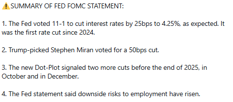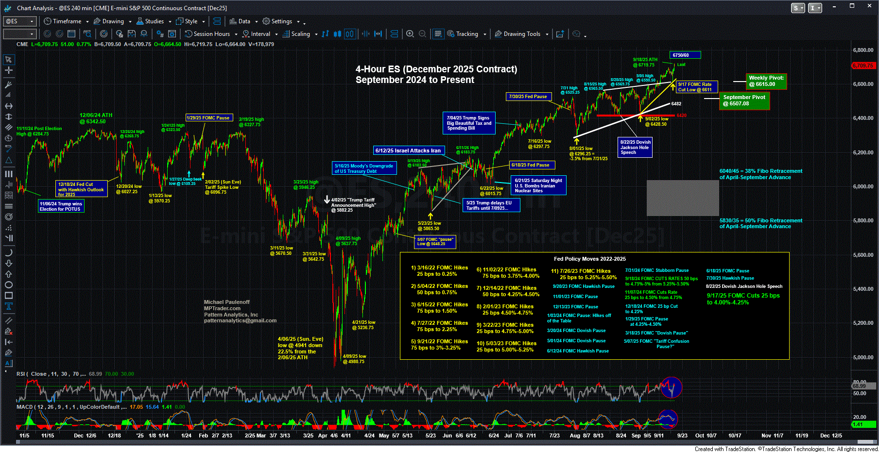 Good Thursday Morning, MPTraders! September 18, 2025-- Pre-Market Update: As we discussed yesterday afternoon, when the dust settles after the index somersaults post-FOMC statement, and post-Powell commentary, we will see the "true" market direction, which we see is UP this AM. ES is up 0.8% and has climbed to a new ATH of 6719.75, at the upper boundary of my next higher Target Zone of 6700-6720.