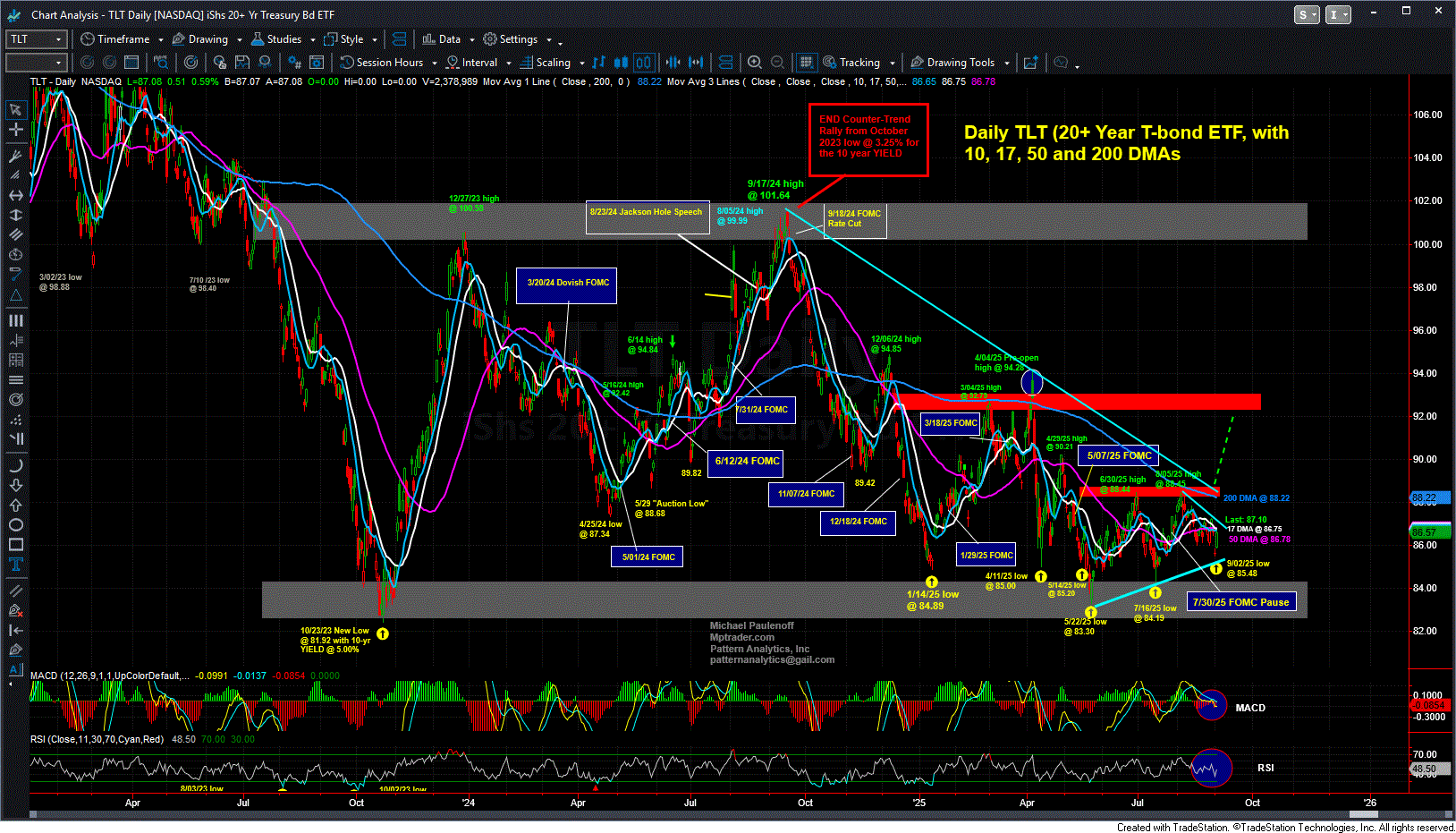 In terms of TLT (20+ Year T-bond ETF), to gain serious upside traction (implying lower longer-term rates), the price structure will need to climb and sustain above consequential resistance at 88.20 to 88.45 (see my attached Daily Chart), which includes the 200 DMA, now at 88.22.