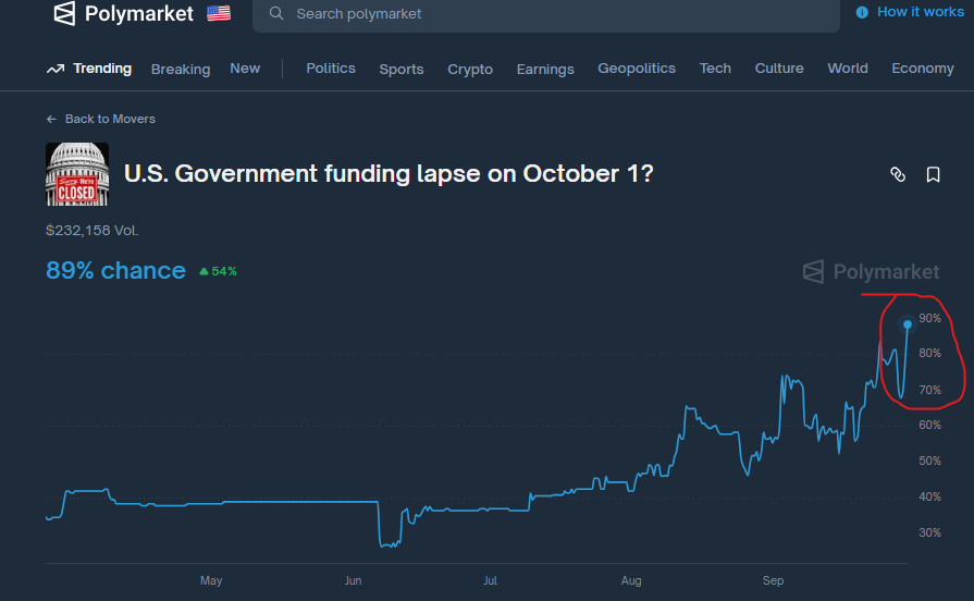 -- No Economic Data today, BUT the growing prospect of a Government Shutdown at Midnight tonight appears to be a done deal. According to Polymarket, there is an 89% chance of a shutdown...