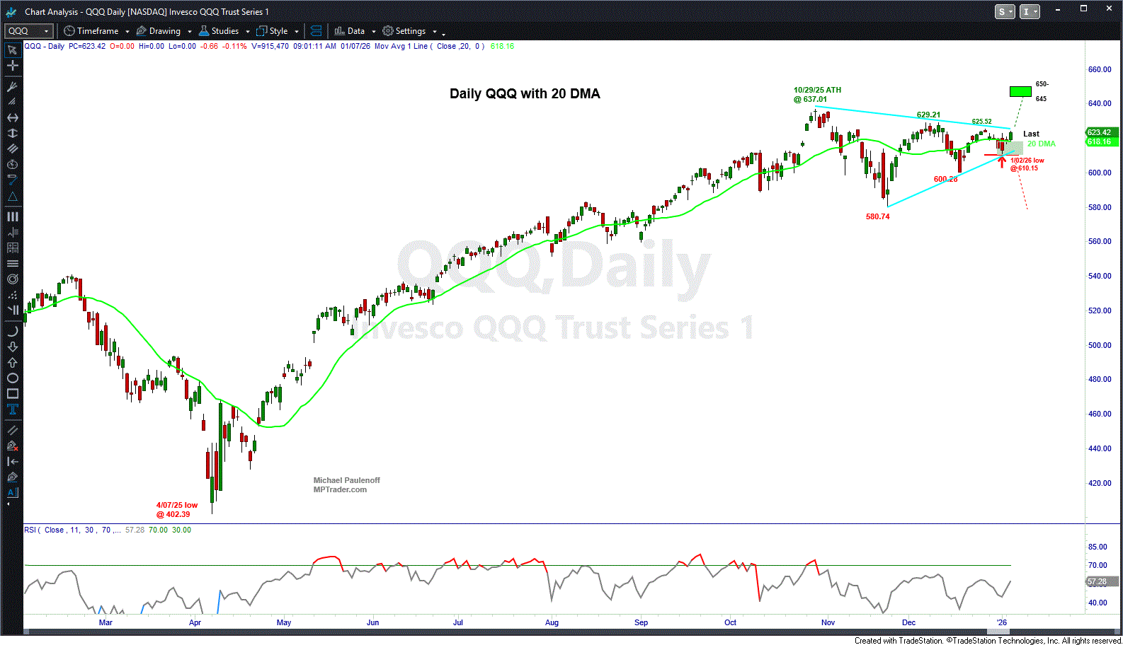 QQQ-- As long as any forthcoming weakness is contained above or within support lodged from 618 to 610, QQQ points higher to an optimal target zone of 645-650... Last is 622.78...