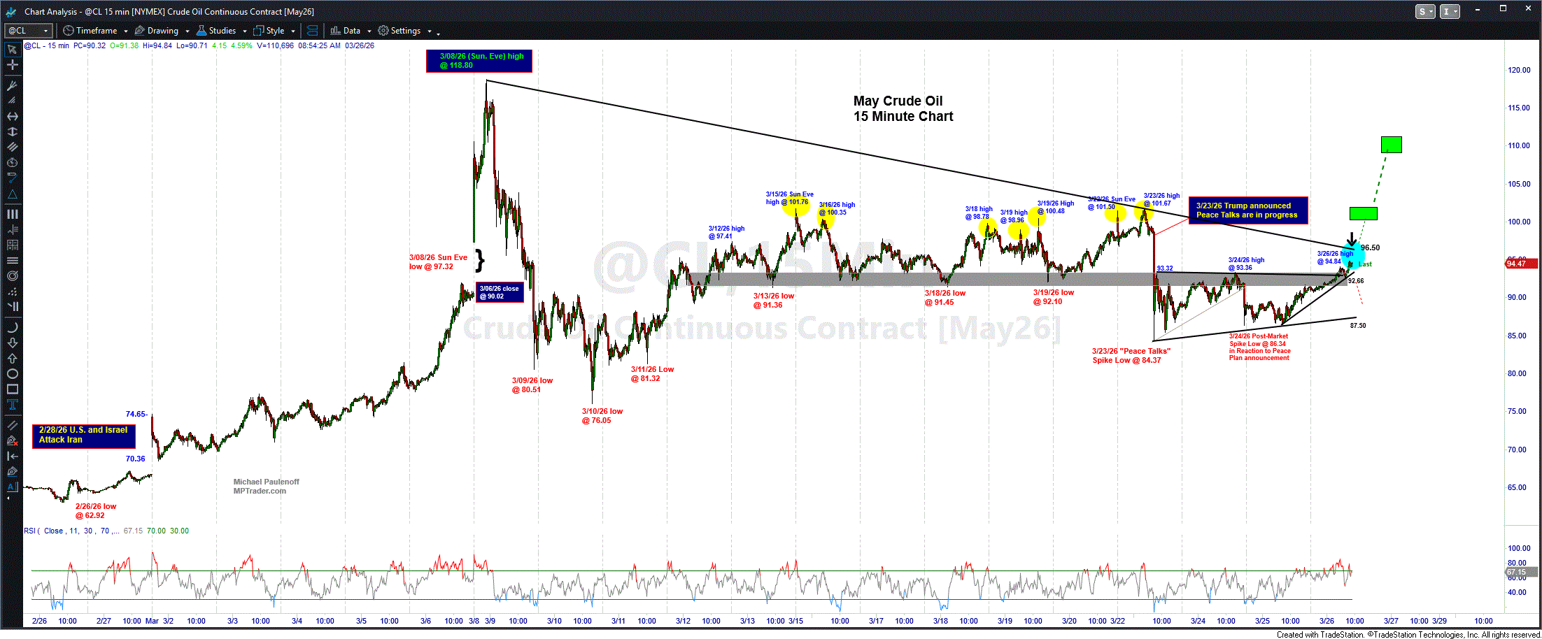 Yesterday morning at this time, May Crude was circling 87.00. Fast-forward 24 hours, we see May Crude circling 94.50 (+8.6%), and pushing up toward a challenge of the dominant resistance line off the March 8th post-war high at 118.00 that cuts across the price axis in the vicinity of 96.50 as we speak. If the resistance line is hurdled and sustained, May Crude will point to a full-fledged retest of the multiple price highs this past weekd in and around 100-101.65, which, if taken out, will trigger upside potential to 110-112 in and orderly market.