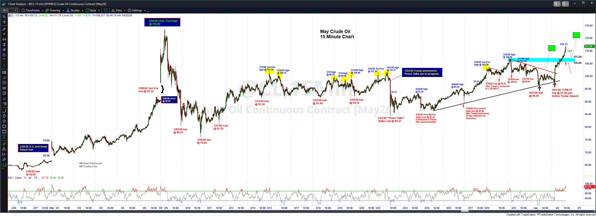 Front month May NYMEX Crude Oil rocketed from 97.50 just before Trump's speech to a high-- as I am typing this post-- at 112.77 (+15.7%) so far this AM, which we see on my attached 15 Minute Chart has satisfied my next higher target window.