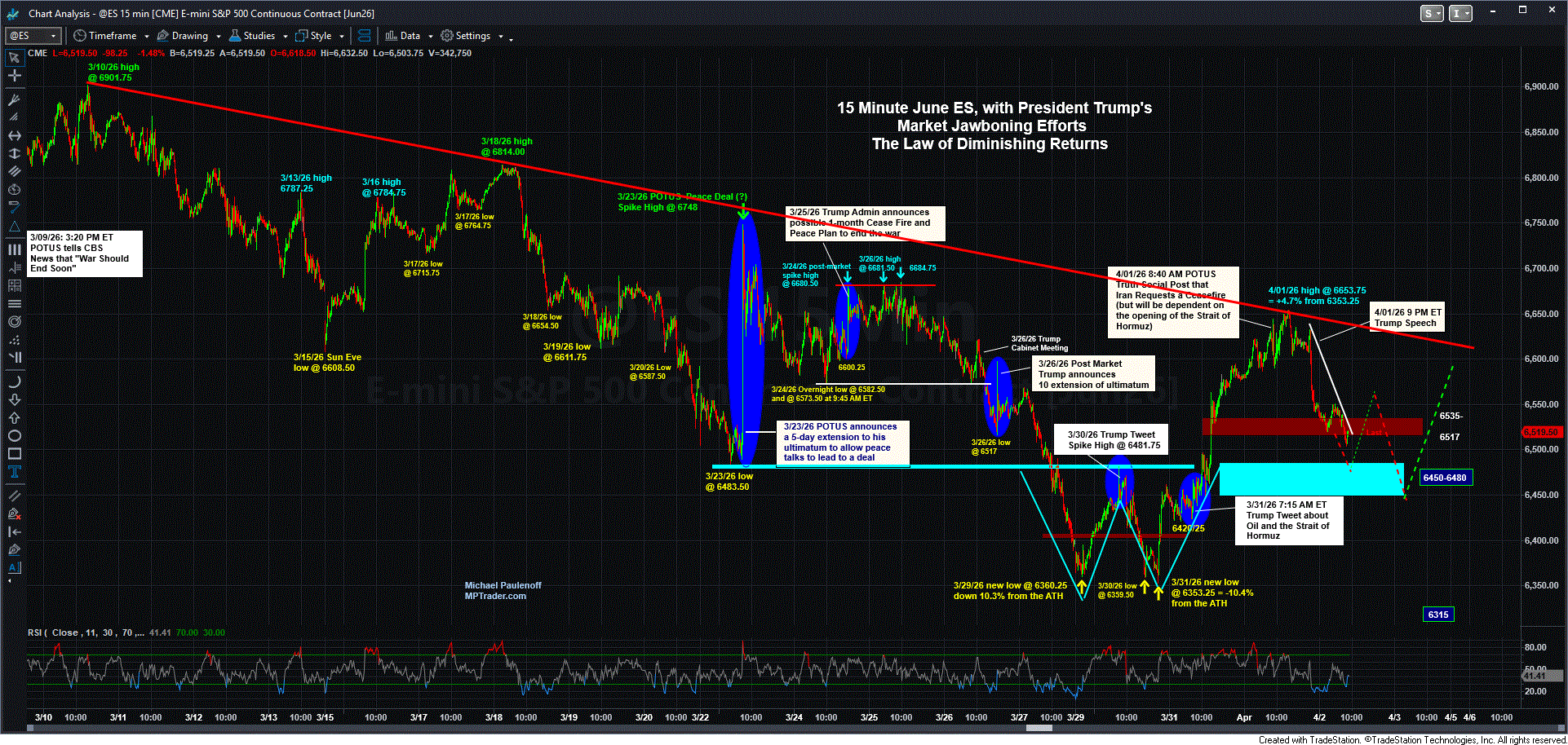 Meanwhile, equity futures are down 1.50%. My attached 15 Minute Chart shows ES nosediving right after Trump's speech began, embarking on a deep correction of the Tuesday-Wednesday 4.7% upmove. So far, at the pre-market low of 6503.75, ES has retraced exactly 50% of the two-day advance.