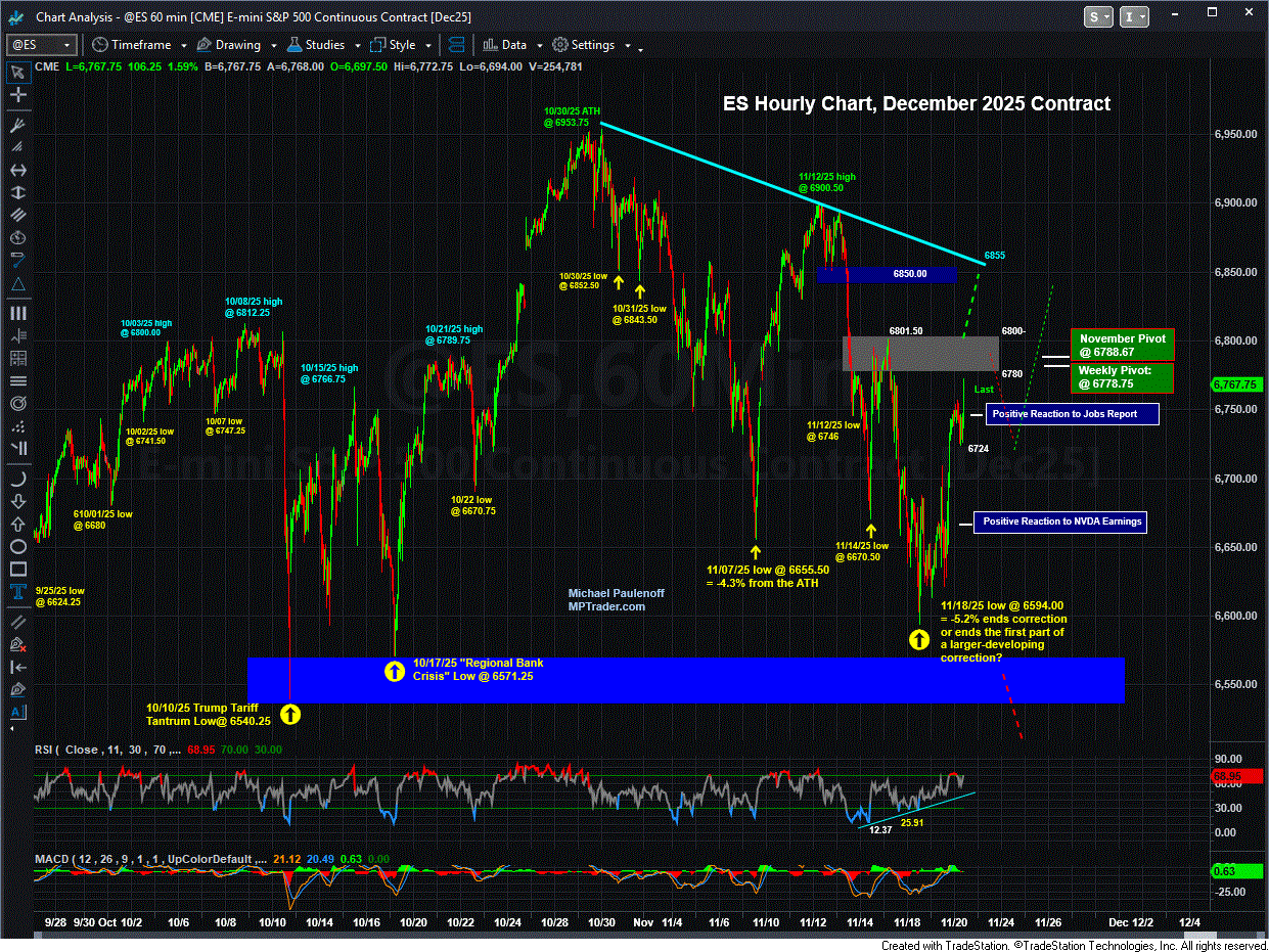 The stronger-than-expected September Payrolls data elicited a positive reaction from the Equity Indices. On top of the NVDA-induced ES vertical spike from 6680 to 6740, the index spiked to a high of 6772.75 so far, a full 2.7% above Tuesday's 5.2% corrective low from the ATH...