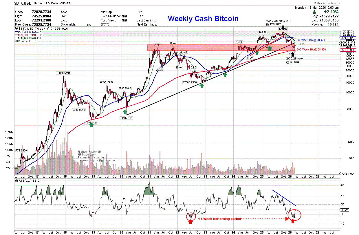 My Weekly BTC setup indicates that the 70,000 down to up-sloping 200 Week MA, now at 58,085, is the potential bull-bear-battle Turn Zone that will be played out over a 4 to 6 week period, likely the requisite timeframe for WEEKLY Momentum to bottom, create a positive divergence, and then turn up... While nothing is written in stone, especially when it comes to the mysterious world of Crypto pricing, these three views provide us with technically-based scenarios to help us manage our expectations of what could lie directly ahead for Bitcoin... Last is 69,322...