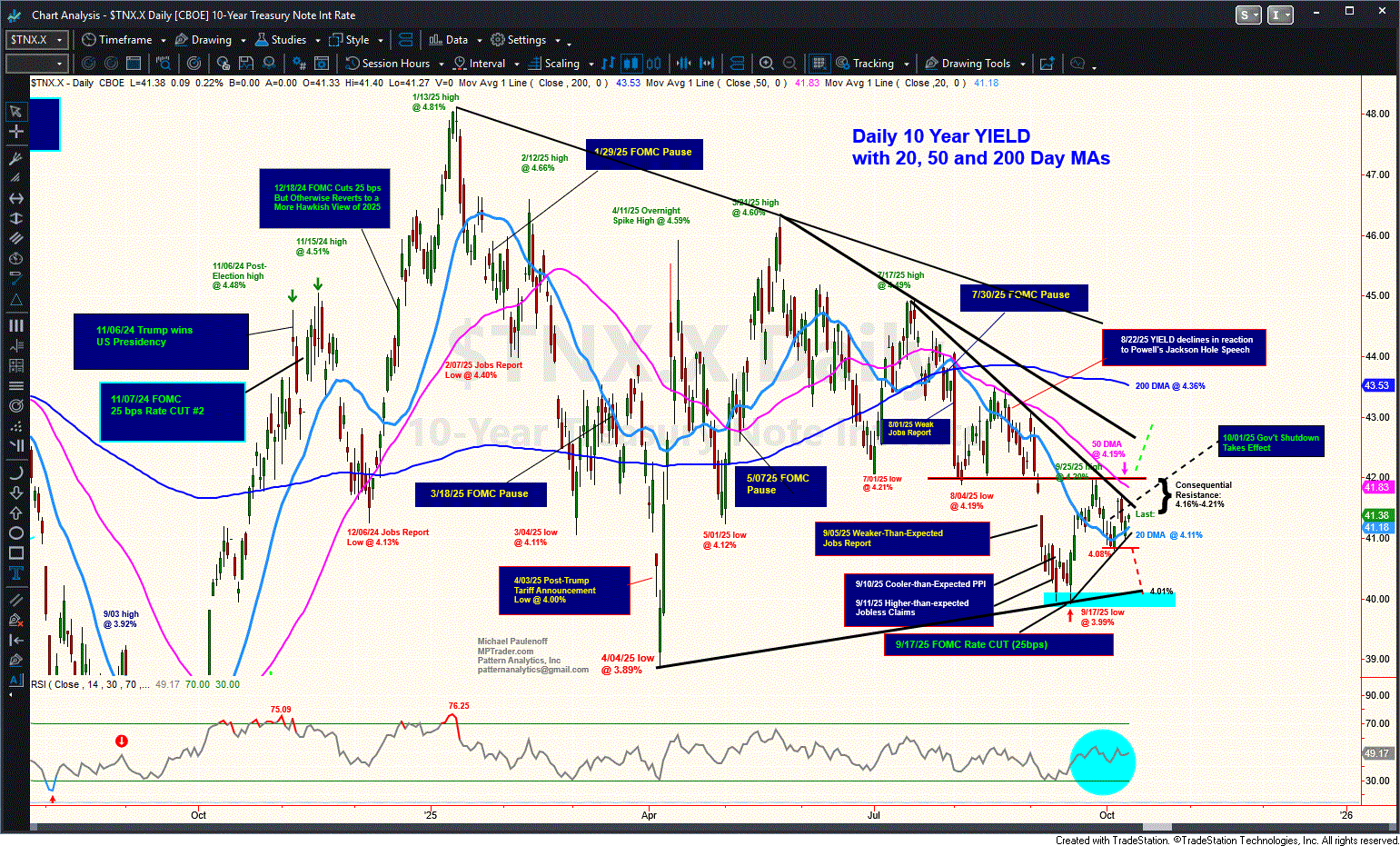 Benchmark 10-year YIELD starts today's session at 4.14%, which we see on my attached Big Picture Chart is encased between important resistance from 4.16% to 4.21% and support at 4.08% to 4.11%. Whichever side of the range is taken out and sustained will trigger directional continuation potential to 4.27%-4.30%, or to 3.95%-4.00%. In as much as the dominant intermediate-term trend is down, my technical bias tilts to the downside for a revisit of the 4.00% September lows... Last is 4.14%... (Continued below YIELD)...