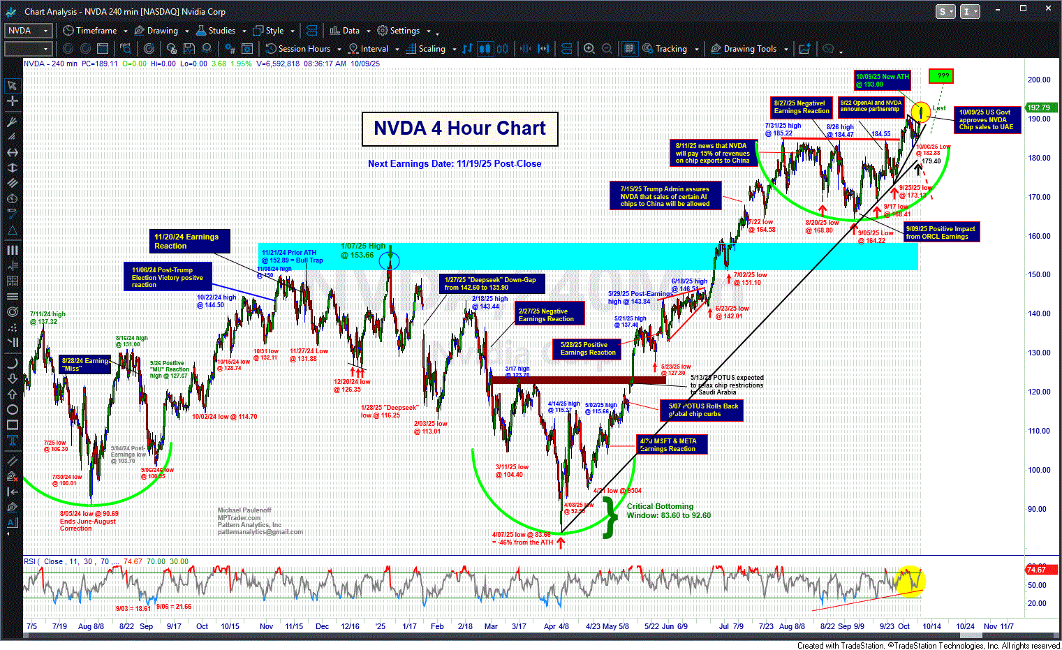 NVDA has climbed to a new ATH at 193.00 in pre-market trading in reaction to news that the US Government has approved NVDA chip sales to the UAE. My attached 4-Hour Chart shows this "breakaway" up-gap pre-market open and upside follow-through has the right look of the initial of a new upleg that projects to 198.00-200.00 next, with overshoot to 205 before my pattern expectation for a correction.