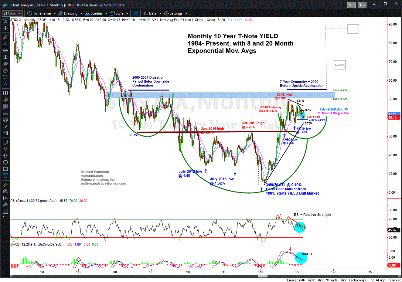 My attached Monthly Chart of benchmark 10-year YIELD shows the YIELD structure is pointed lower and accompanied by negative and nosediving monthly Momentum gauges, all of which suggest strongly that YIELD is poised for a test of key support lodged between 3.90% and 4.00%, which under-shoot to 3.70% to test the dominant up trendline from the March 2020 Pandemic lows... (Continued below my YIELD chart)...