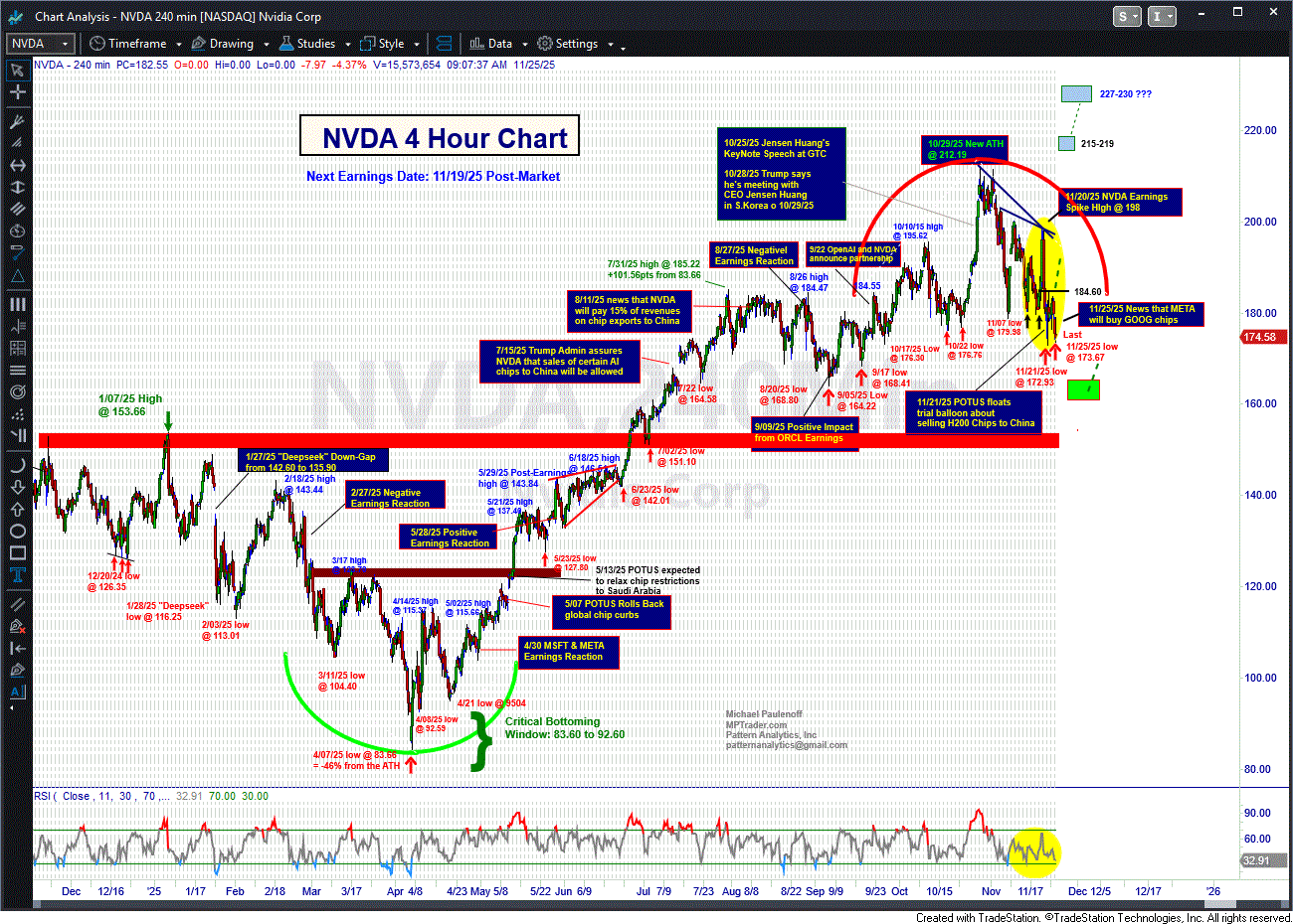 -- News emerged in the wee hours this AM that Mark Zuckerberg (META) purportedly is negotiating to buy Google Chips (TPUs) instead of NVDA chips, which has triggered algorithmic selling in NVDA (-4%) in pre-market trading. My attached 4-Hour Chart shows NVDA weakness is pressing toward a full-fledged retest of last Friday's pre-market spike low at 172.93-- if violated and sustained on a closing basis, will project downside continuation toward 164-167 next... Last in pre-market is 174.49...