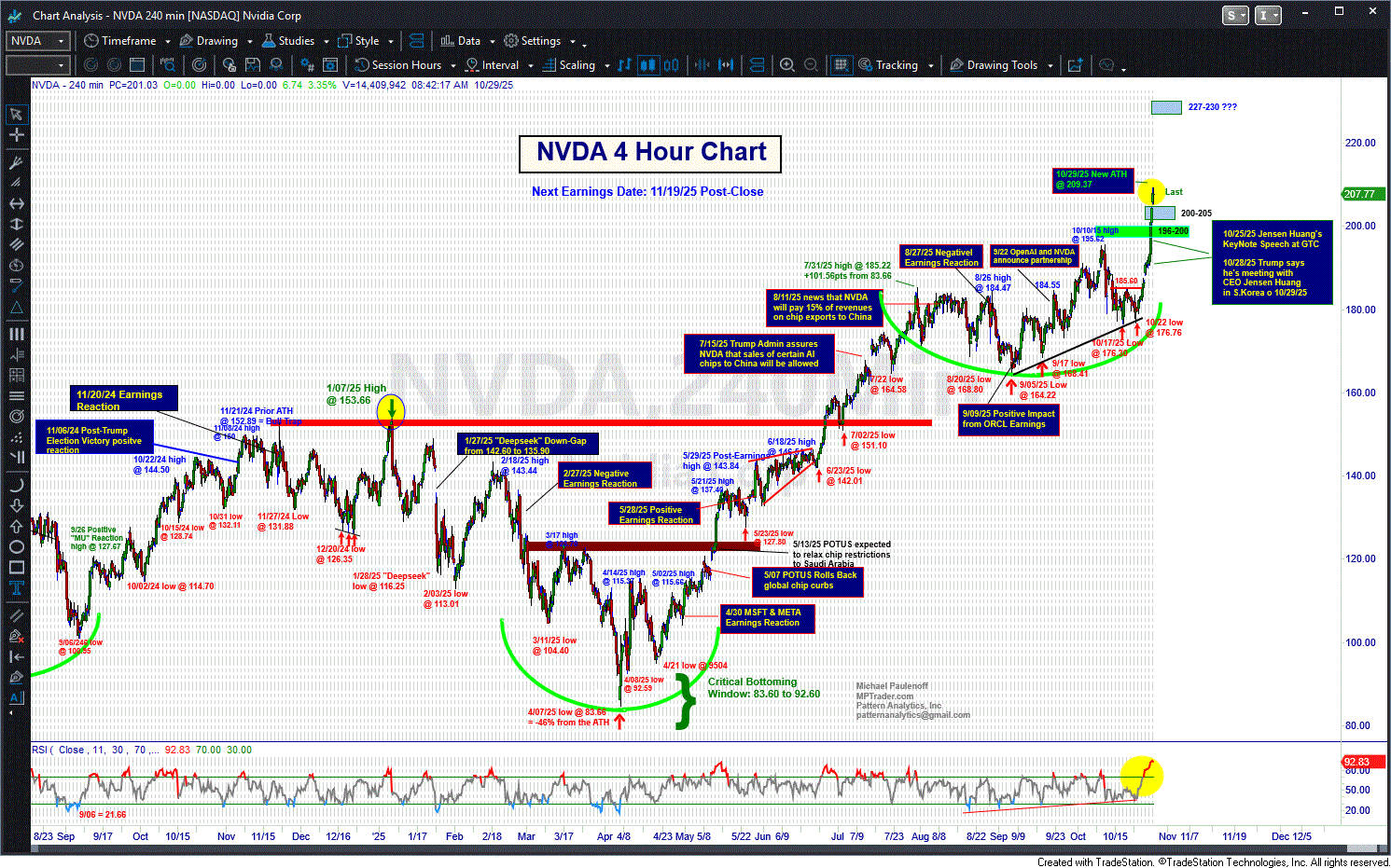 Technically, my attached 4-hour chart shows that NVDA has blown past my target zone of 200-205 forecast after the conclusion of the August-September correction from 185.22 to 164.22, which triggered a higher intermediate-term projection of 227-230. As long as any forthcoming weakness is contained within or above support from 196 to 200, the 227-230 target zone will remain technically viable... Last is 207.78... (Continued below my NVDA Chart)...