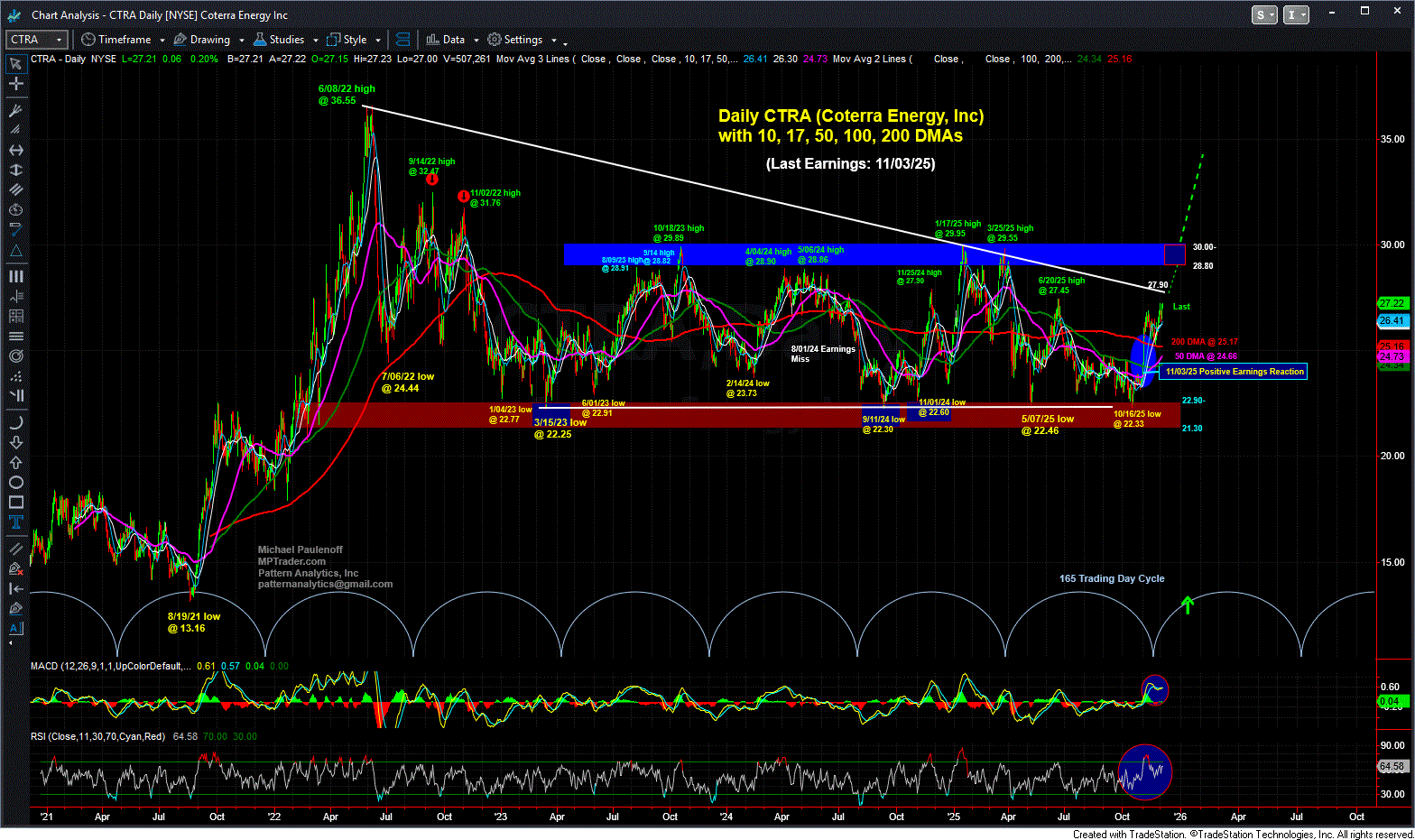 -- CTRA is an energy company that primarily produces Nat Gas. Technically, all of the price action from the June 2022 High at 36.55 has the right look of a prolonged digestion period after the August 2019 to June 2022 bull phase from 13.16 to 36.55. A climb and close above 28.00 will indicate that CTRA is emerging from the massive sideways pattern into a new upleg and possibly a new bull phase that is precipitated by the demand for Nat Gas during a Polar Vortex type event (overlayed on rising demand from data center energy usage). As long as any forthcoming weakness is contained above 24.50, the technical setup will remain promising and bullish from an intermediate-term perspective... Last is 27.07...
