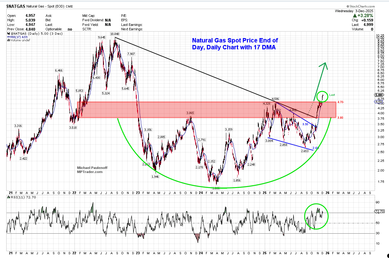 -- Nat Gas has broken out of a three year base-accumulation period and pattern that triggers upside potential to 7.50-8.00 derived from the technical setup, however, we all know that if there is an acute weather situation, i.e., a Polar Vortex, that Nat Gas could "go vertical" under the circumstances...
