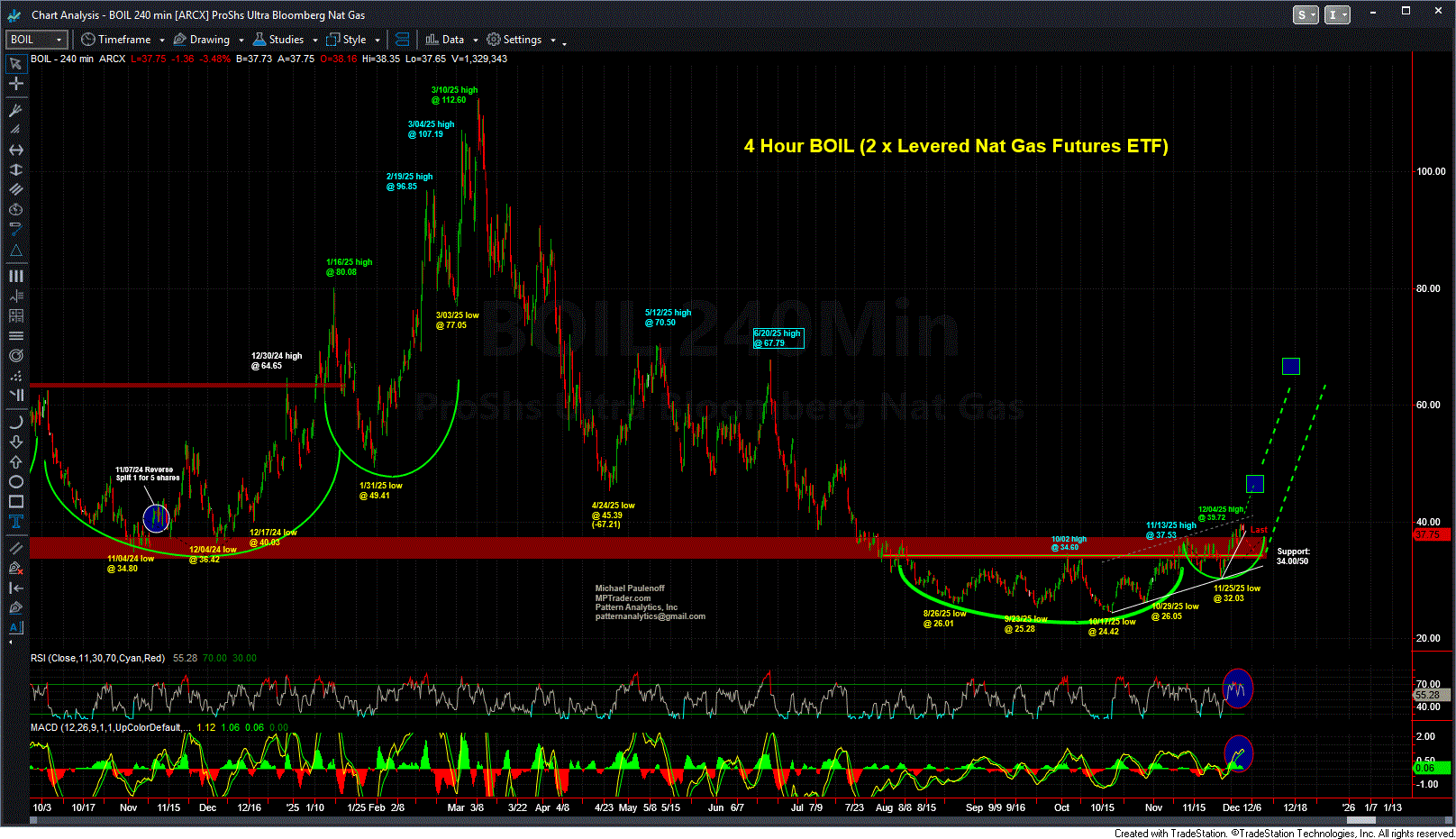 -- BOIL has emerged from a multi-month base formation that triggered upside projections to 44-48 in a "normal" technical market, however, again, if an acutely frigid weather event emerges this winter, BOIL will point to 65-70, and possibly higher. Because this is an otherwise manipulated market, in the absence of a weather event, let's expect crazy two-way volatility in the interim. On weakness, key support resides from 34 down to 32. Below 32, the setup gets much less dependable... Last is 37.55...