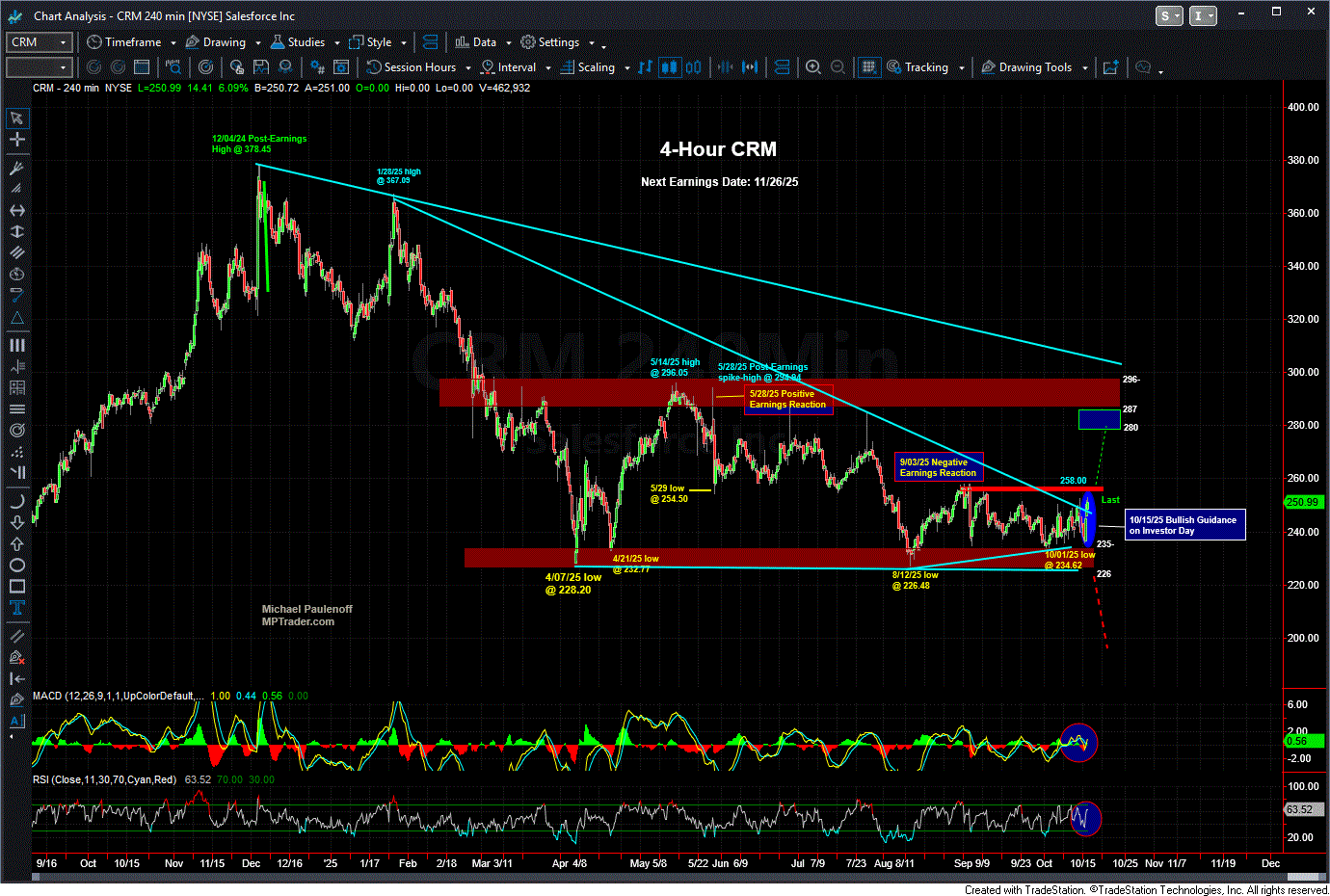 On any forthcoming nearest-term weakness, 245-247 support must contain the sell-off to preserve and to extend the budding bullish technical setup on the runway to CRM Earnings scheduled for 11/26/25... Last is 250.98...