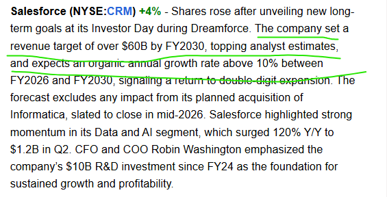 -- CRM (Salesforce.com), which imo has been traveling under everyone's radar recently, raised its longer-term guidance at yesterday's Investor Day (See Seeking Alpha snippet below). The news has goosed the stock by nearly 7%.