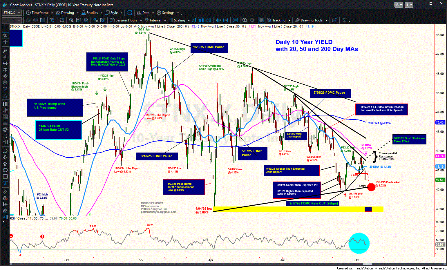 -- Quietly, benchmark 10-year YIELD has slid to 4.0%, now sitting at 4.02%, which we see on my attached Daily Chart represents a retest of the April-October 2025 support line that if violated and sustained, will point to a retest of the April 2025 low at 3.90%. Perhaps buying longer-dated Treasury bonds reflects BOTH the ongoing Government shutdown, now in day #14 AND a flight-to-safety (considering how overbought Gold is perceived to at this time)...