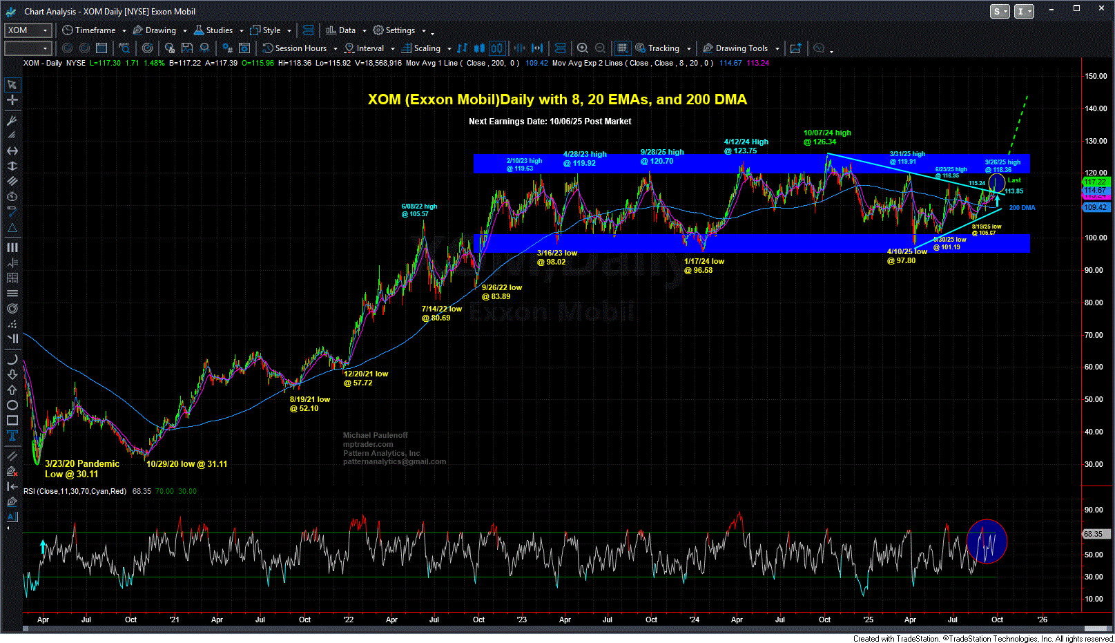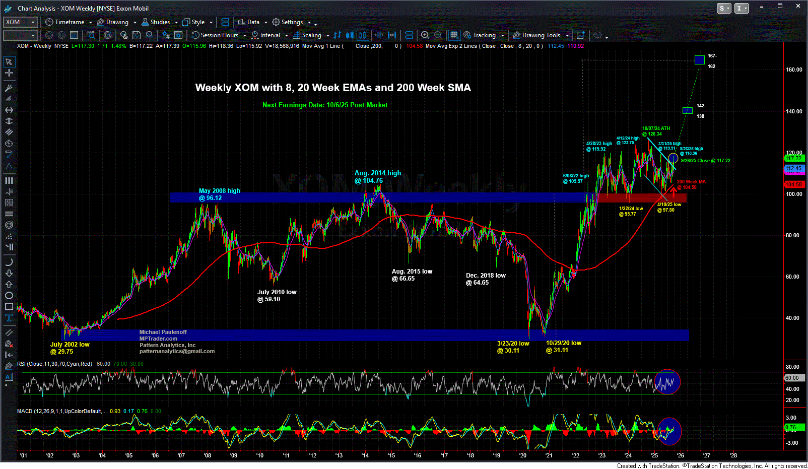 Fast-forward to this past Friday's close (9/26/25) at 117.22, a full 5% above my 8/25/25 update, we see on my Daily XOM Chart setup that the price structure has thrust above an 11-1/2 month resistance line (113.85), from where it climbed to 118.26 so far (closing at 117.22).