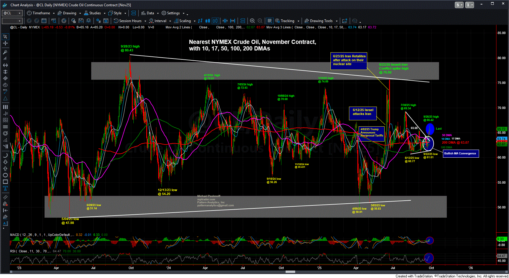 As for NYMEX Oil prices, my attached November Crude Oil Chart setup shows multiple failed attempts to press beneath $60-$61 support, followed by last week's upside pivot reversal and climb to $66.42 (+8%). Furthermore, let's notice that last week's upside surge emerged from a convergence of near and intermediate-term MAs in the $62.50-$63.70 area, from where November Crude motored $2 to $3 higher. As long as any forthcoming weakness is contained above $62.60 on a closing basis, November Crude Oil is poised for upside continuation...